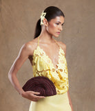 Bolsa modelo leque feita em palha de carnaúba tingida em tom marrom natural. Atemporal, leve e versátil, é um acessório que resgata a tradição trançada da palha nordestina em linhas contemporâneas.