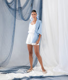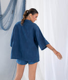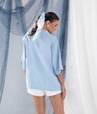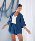 Disponível em offwhite e nos tons de azul tingidos artesanalmente com índigo natural — Oceano Profundo, Maré Mansa e Espuma do Mar —, cada kimono carrega nuances únicas e orgânicas, resultantes do delicado processo manual de tingimento.