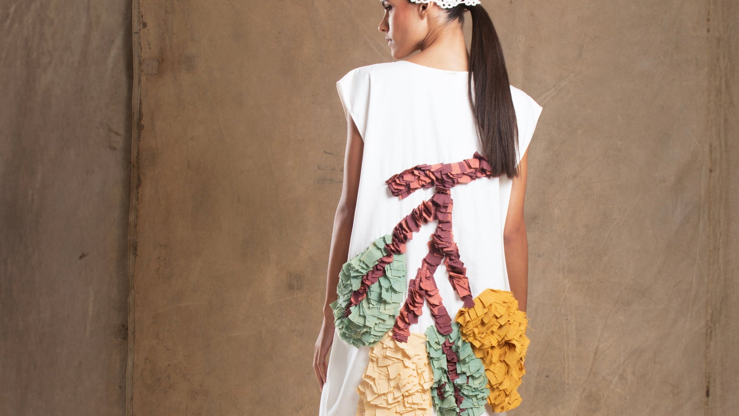 Colete longo em sarja de algodão orgânico com aplicações de cajus feitos em retalhos de linho e algodão puro tingidos naturalmente. A arte se espalha pela frente, laterais e costas, celebrando o reaproveitamento criativo e a estética regenerativa. Fechamento frontal com botão em cerâmica no formato de caju, desenvolvido em parceria com o Estúdio Lira.