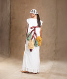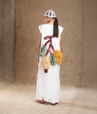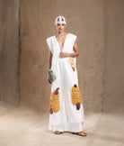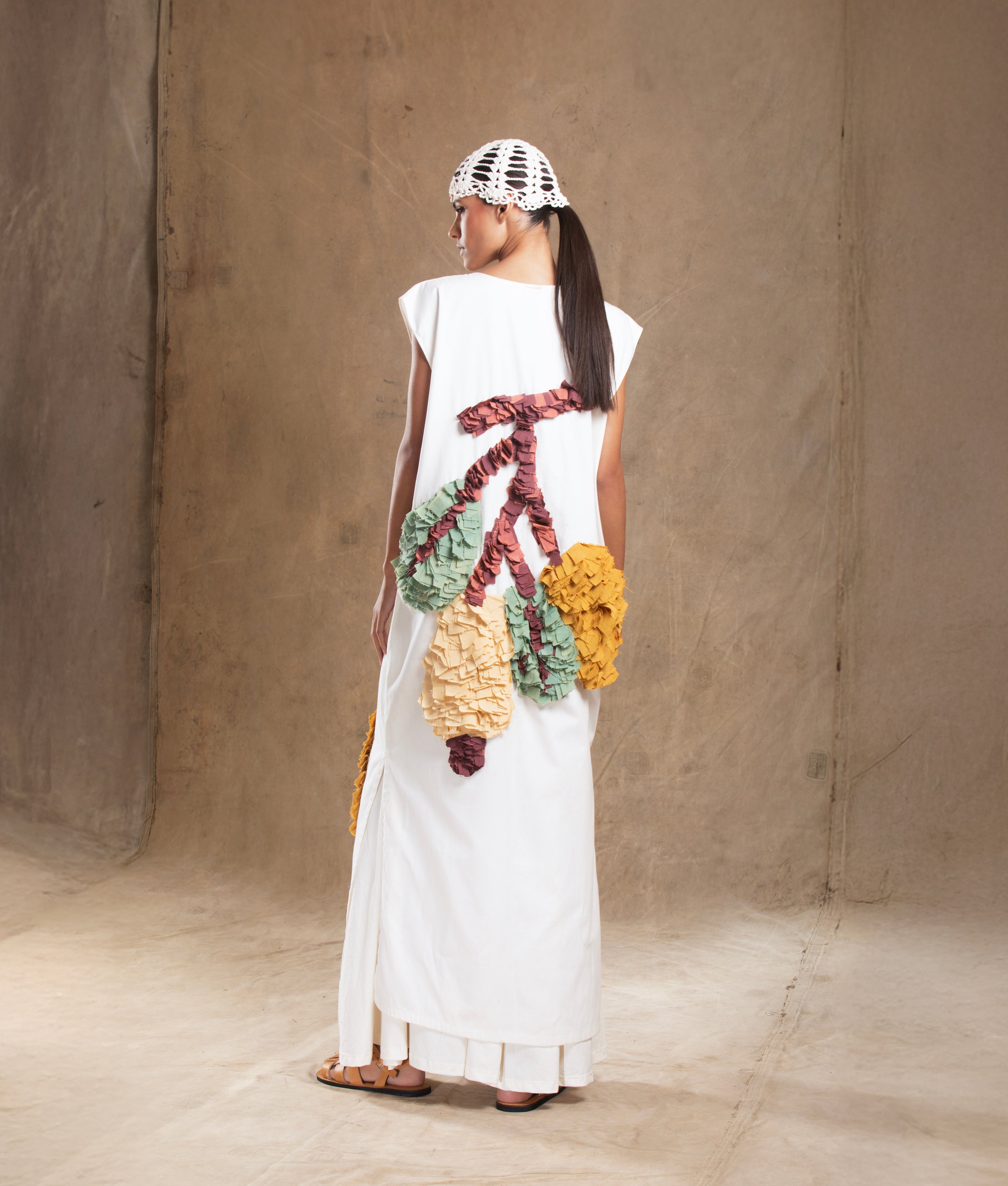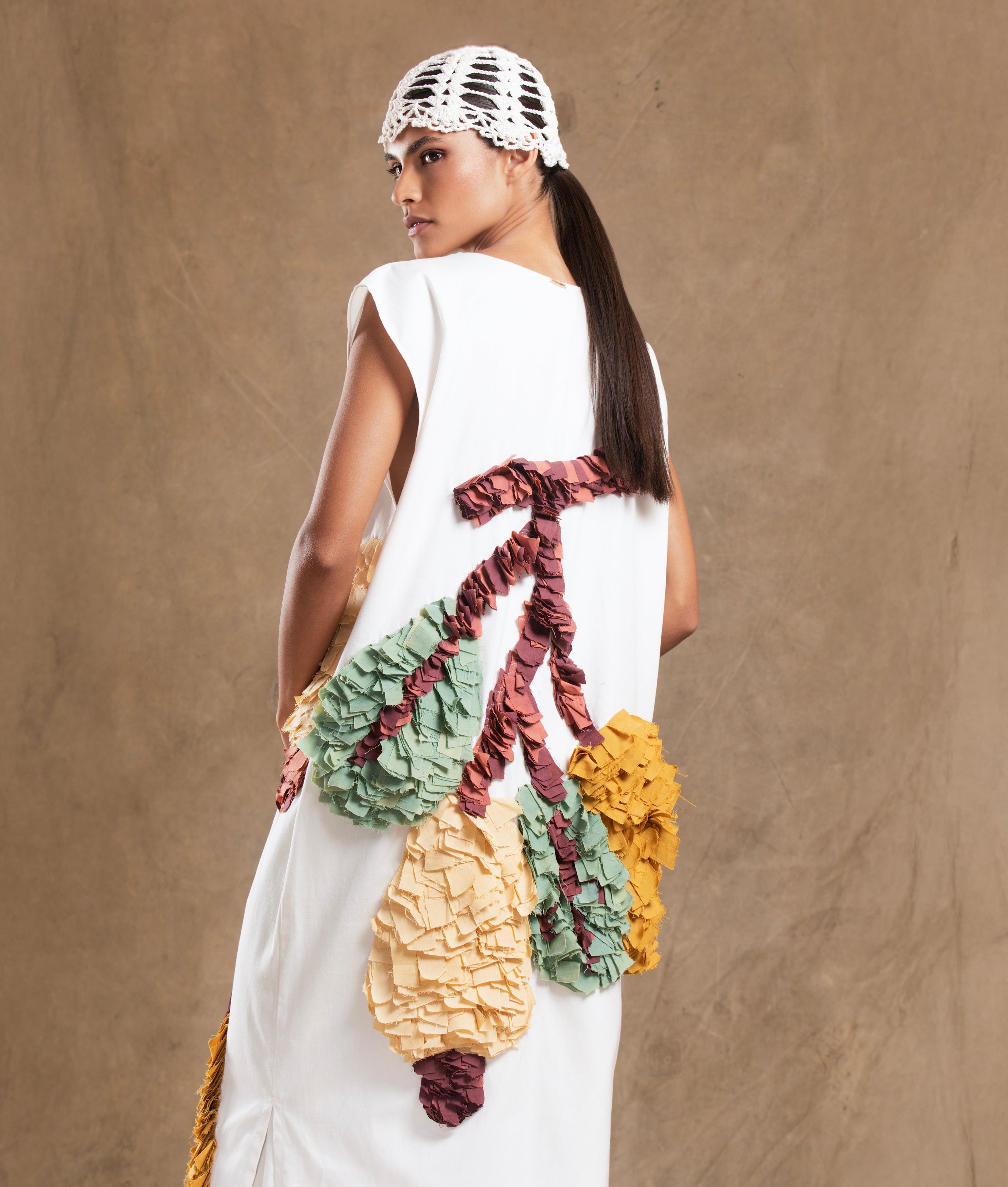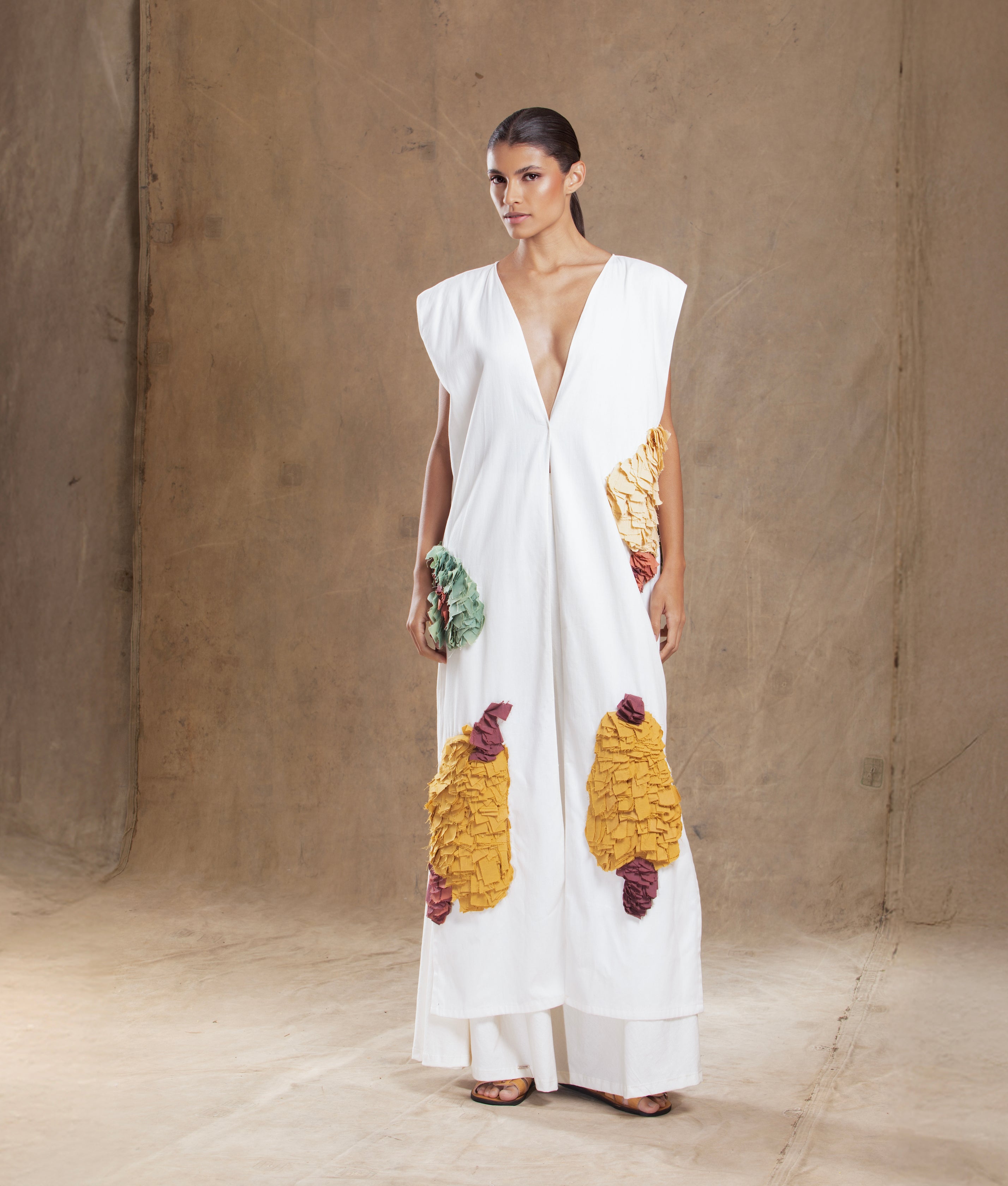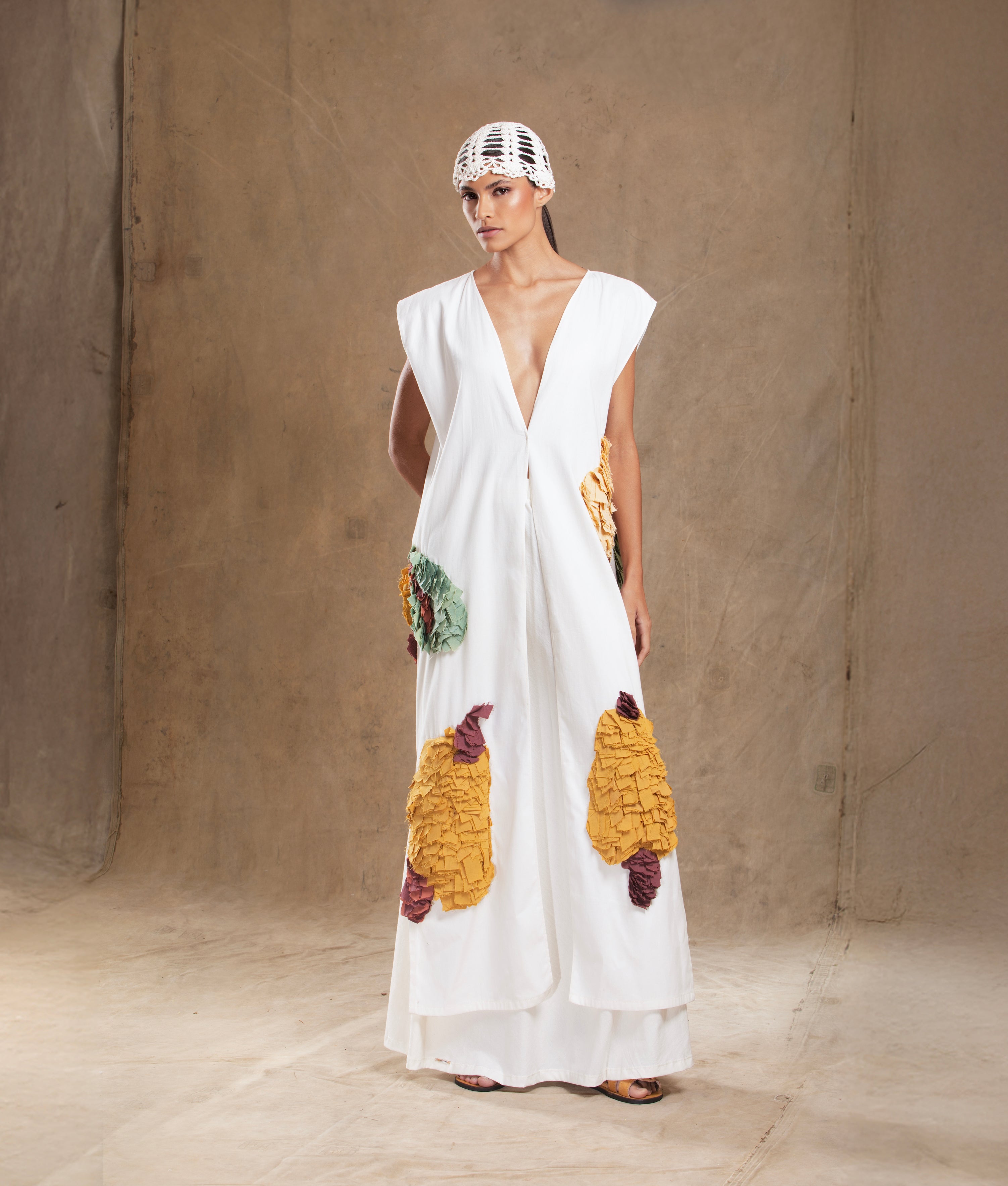 Colete longo em sarja de algodão orgânico com aplicações de cajus feitos em retalhos de linho e algodão puro tingidos naturalmente. A arte se espalha pela frente, laterais e costas, celebrando o reaproveitamento criativo e a estética regenerativa. Fechamento frontal com botão em cerâmica no formato de caju, desenvolvido em parceria com o Estúdio Lira.