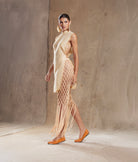 Calça de Macramê CORRENTEZA feita integralmente em macramê artesanal, com fios de malha de algodão orgânico. Possui franjas no comprimento, que acompanham o movimento do corpo. Tingida naturalmente com tanino da casca de araucária em tom amarelado terroso.