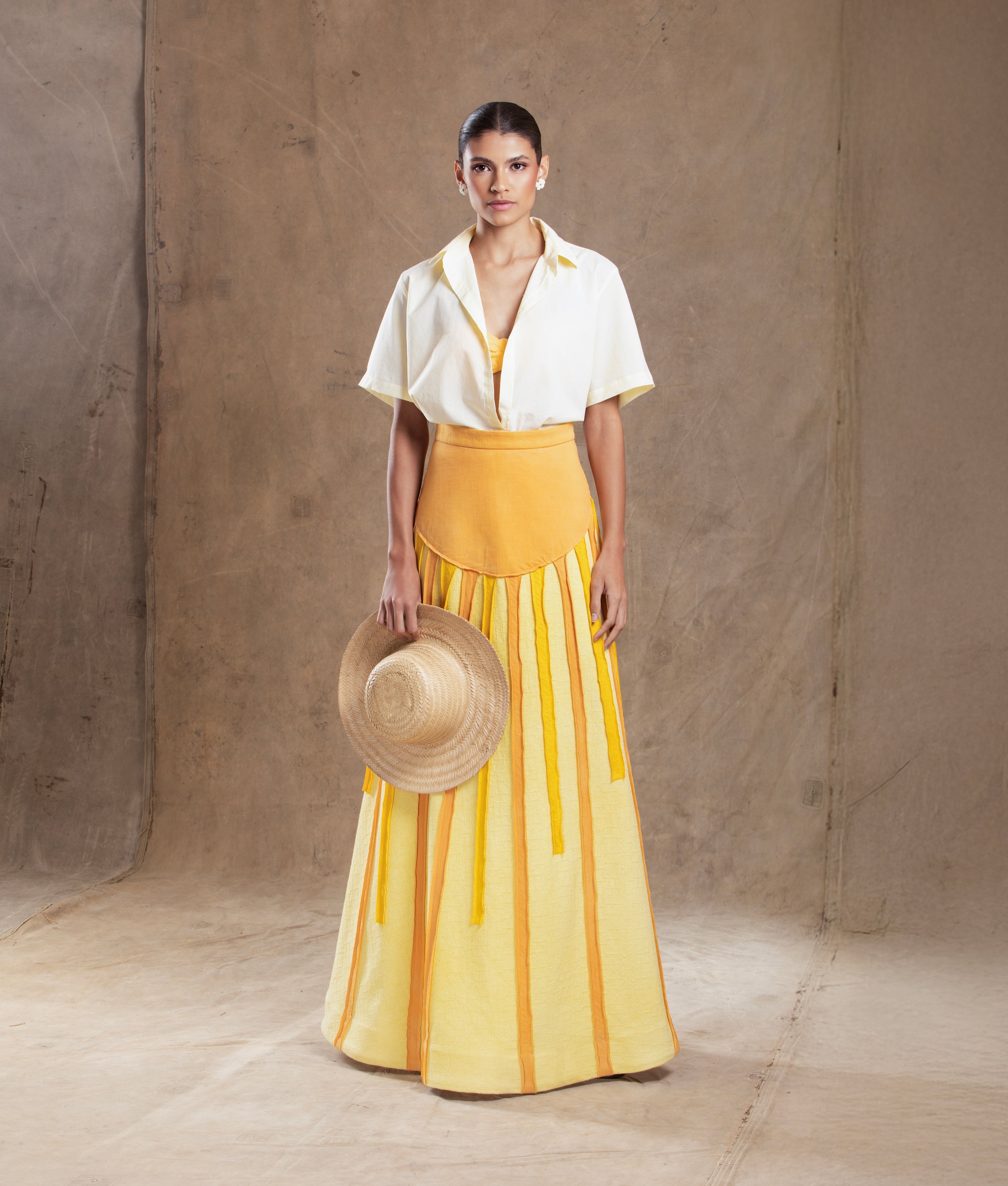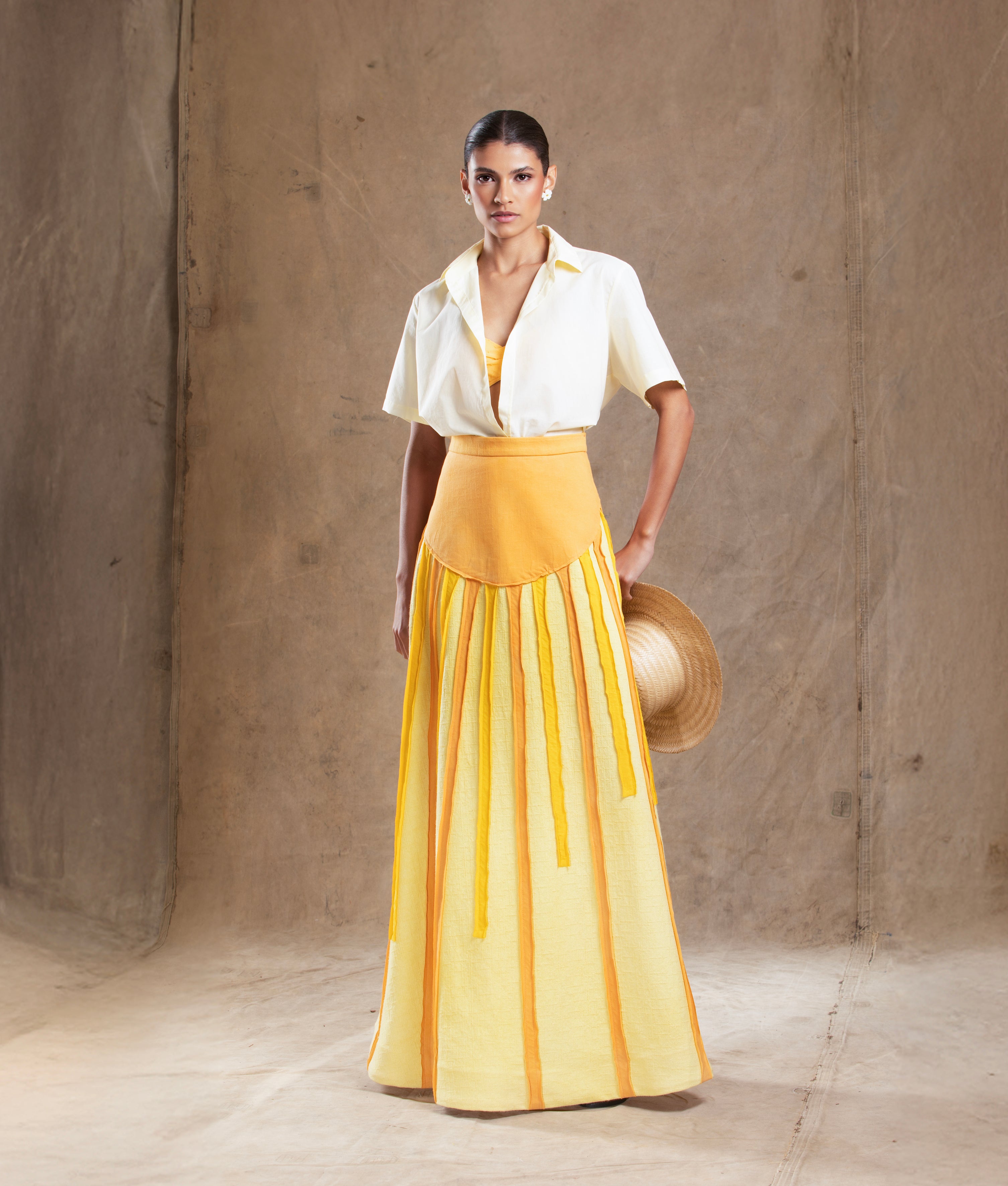 Saia longa em linho puro tingido naturalmente com açafrão e com aplicações em malha de algodão orgânico tingido com casca de cebola e açafrão. Modelo evasê, fechamento em zíper invisível nas costas, garantindo caimento elegante e movimento fluido.