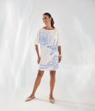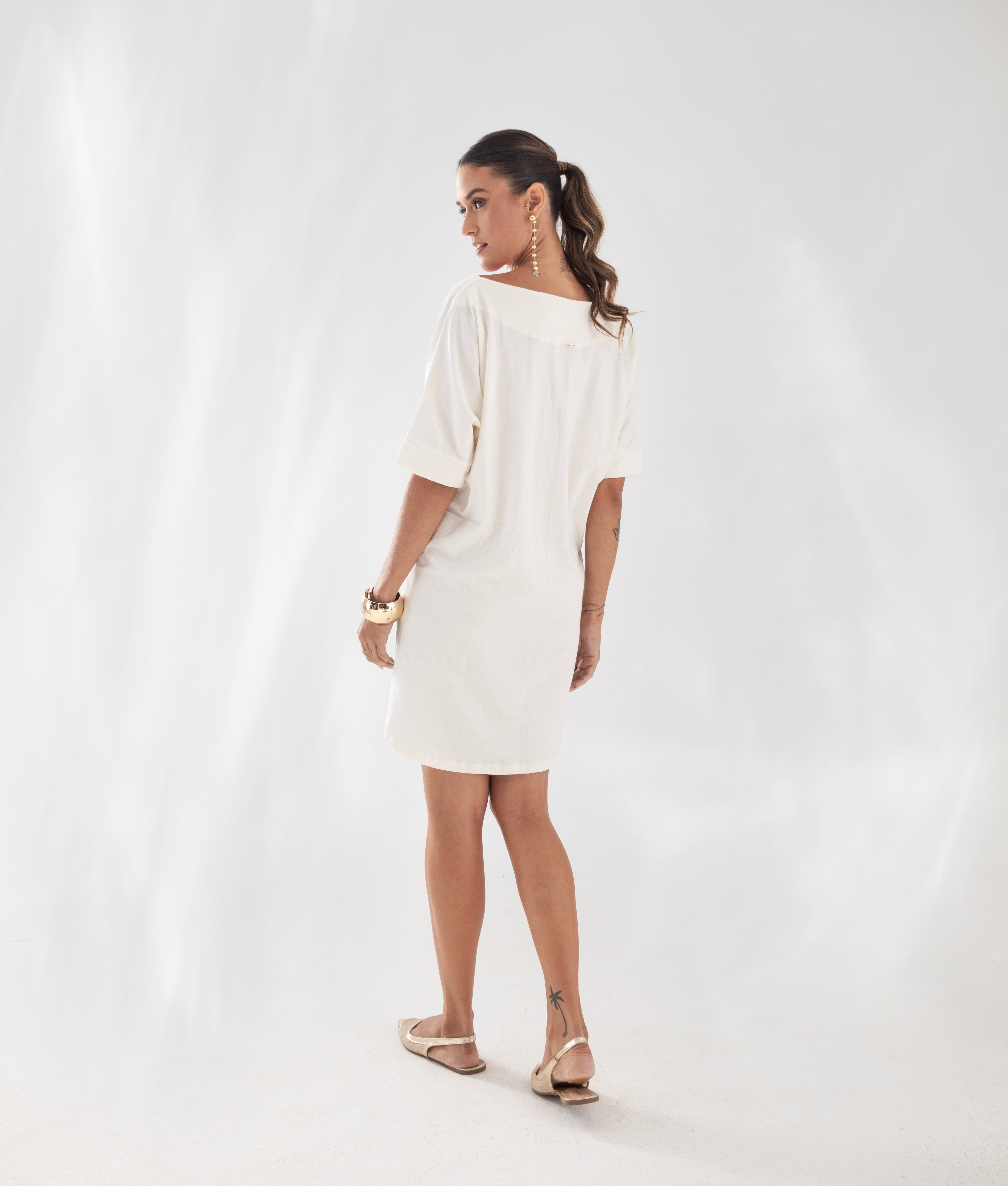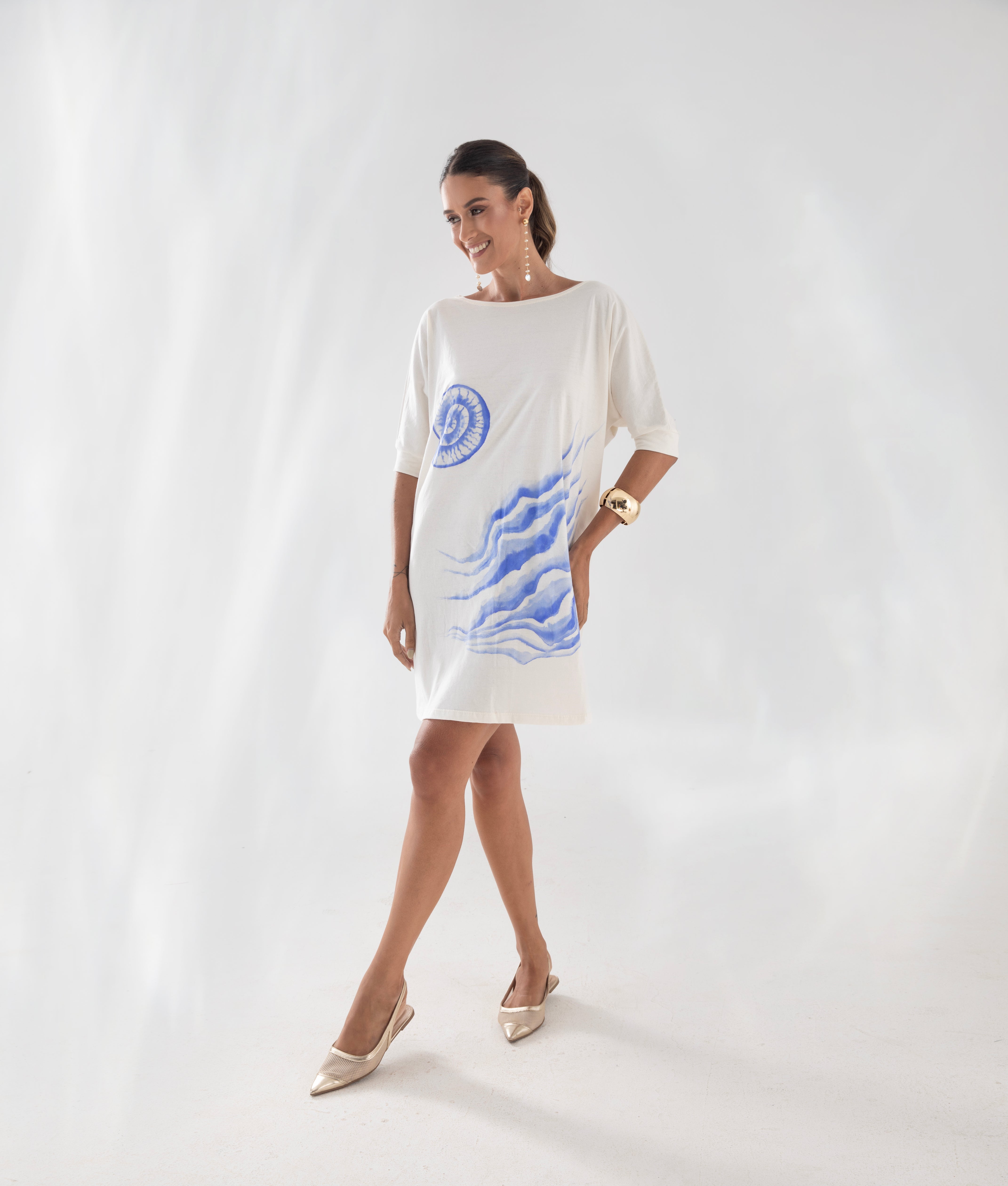 A Maxi T-shirt OCEANO é uma peça que celebra a arte, o conforto e a elegância de quem valoriza o toque de uma fibra como o algodão orgânico em sua cor natural.