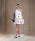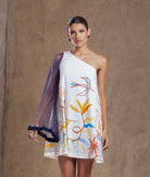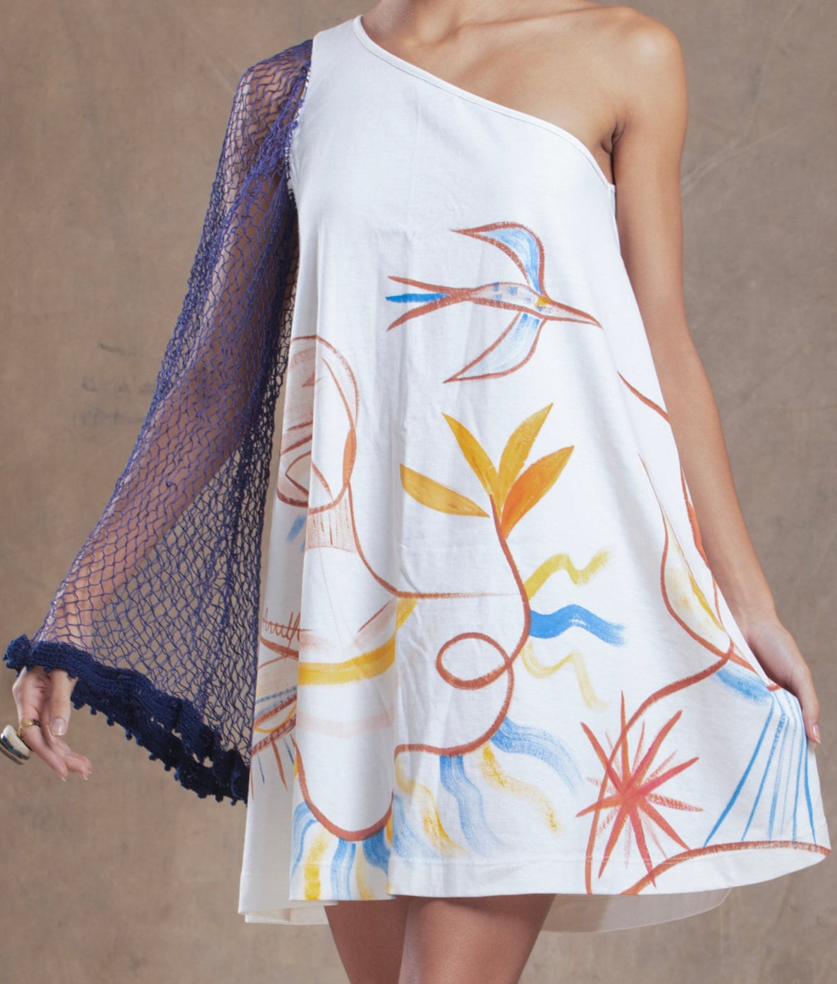 Vestido curto em malha de algodão orgânico, modelo de um ombro só, com manga ampla feita de rede de pesca reaproveitada e acabamento em crochê. Pintado à mão pela artista Ariell Guerra com tintas vegetais 100% naturais. Uma peça fluida que conecta arte, memória e sustentabilidade.