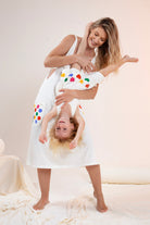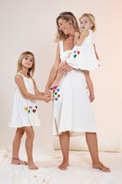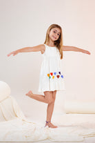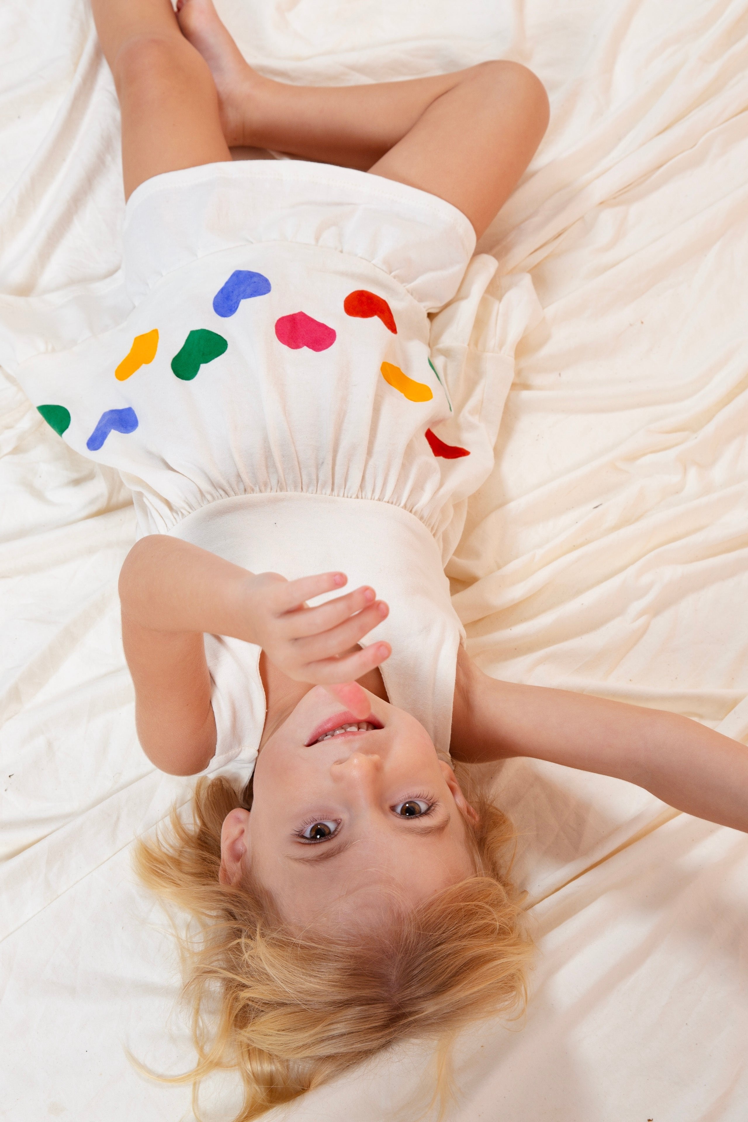 O Vestido Infantil Mangará é feito de malha de algodão orgânico e recebe em sua saia corações coloridos pintados de forma manual através da técnica de stencil. É a Artista de alma doce Sara Jane que amorosamente os colore no ateliê da Villa Dharma, em Nísia Floresta, RN.