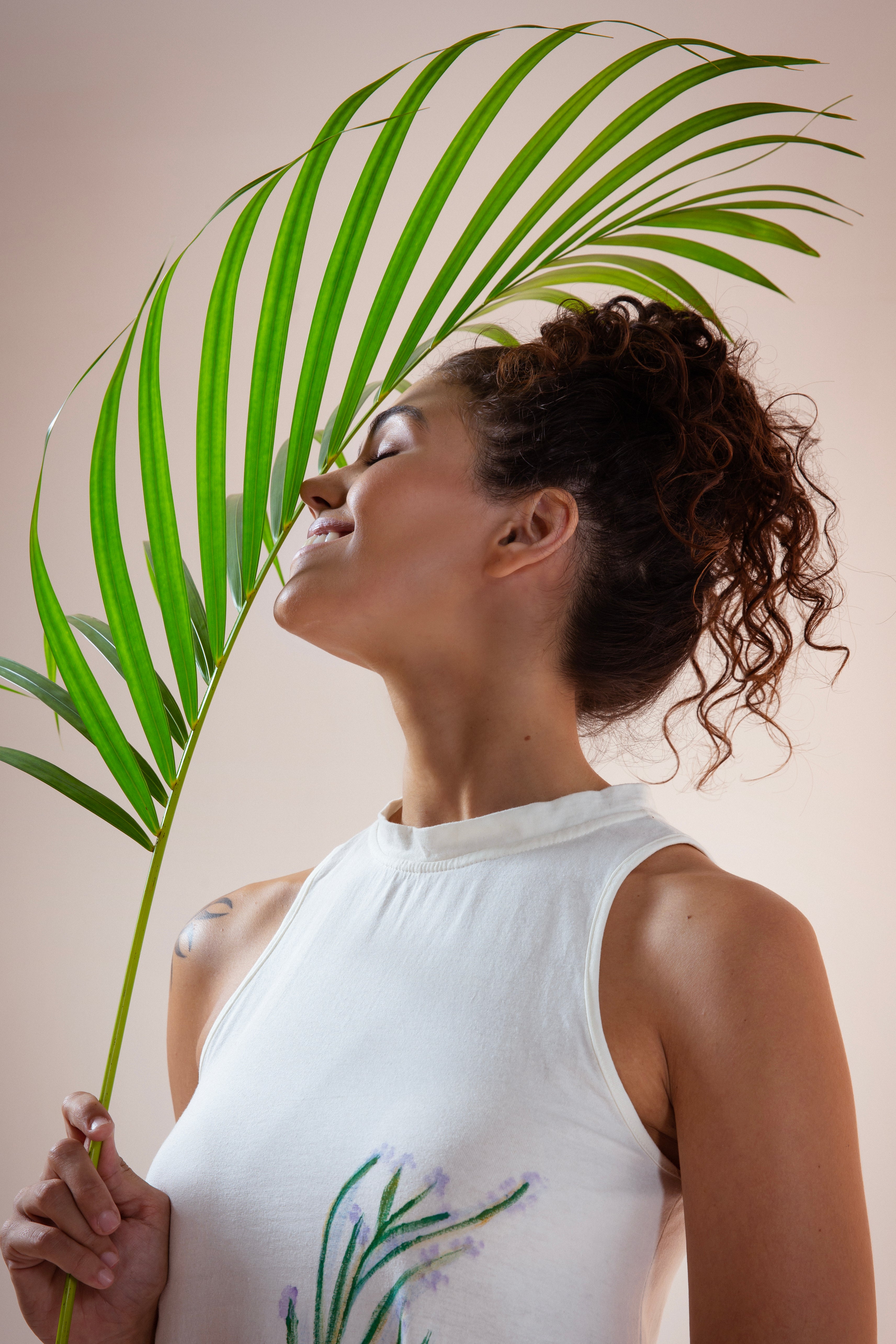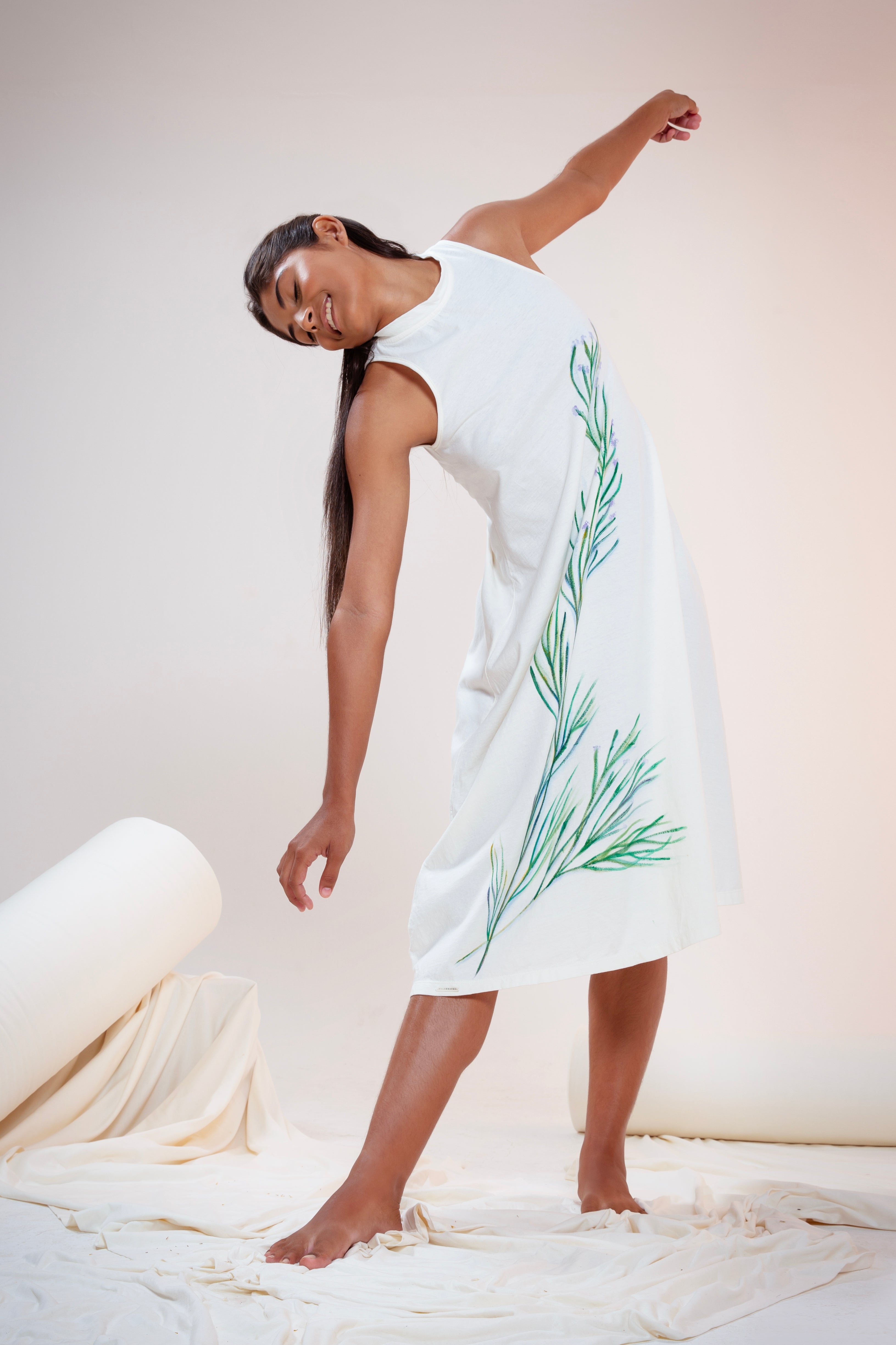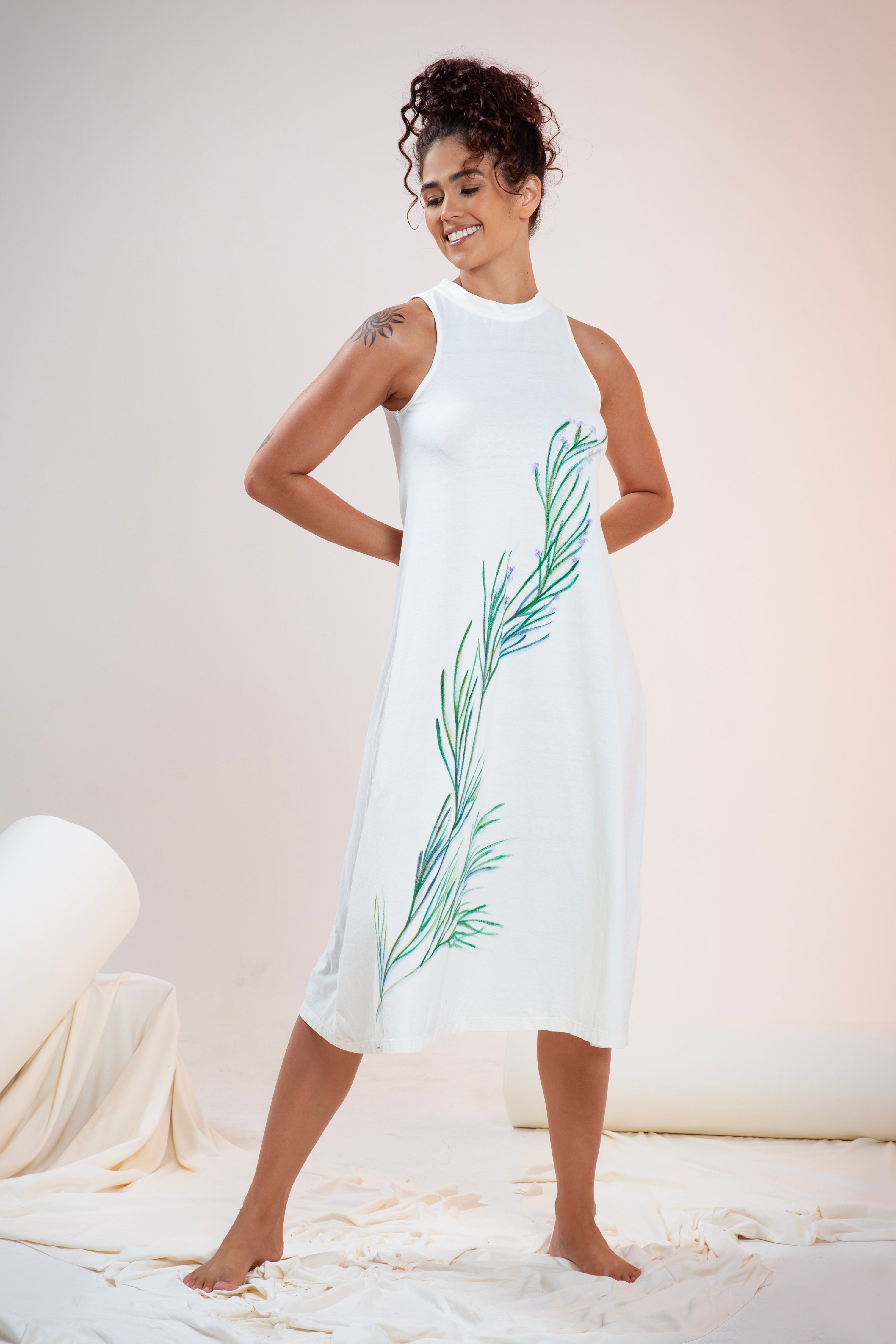 O Vestido Capulho é peça cheia de encantamento e beleza, que recebe ervas energéticas pintadas de forma manual pela Artista e Terapeuta do feminino Flor Atirupa, sobre o conforto da malha de algodão orgânico. A curandeira Flor Atirupa, a partir de tintas totalmente vivas, consagra mais uma etapa desta alquimia linda que convoca à natureza para ser Arte na Cápsula Capulho.