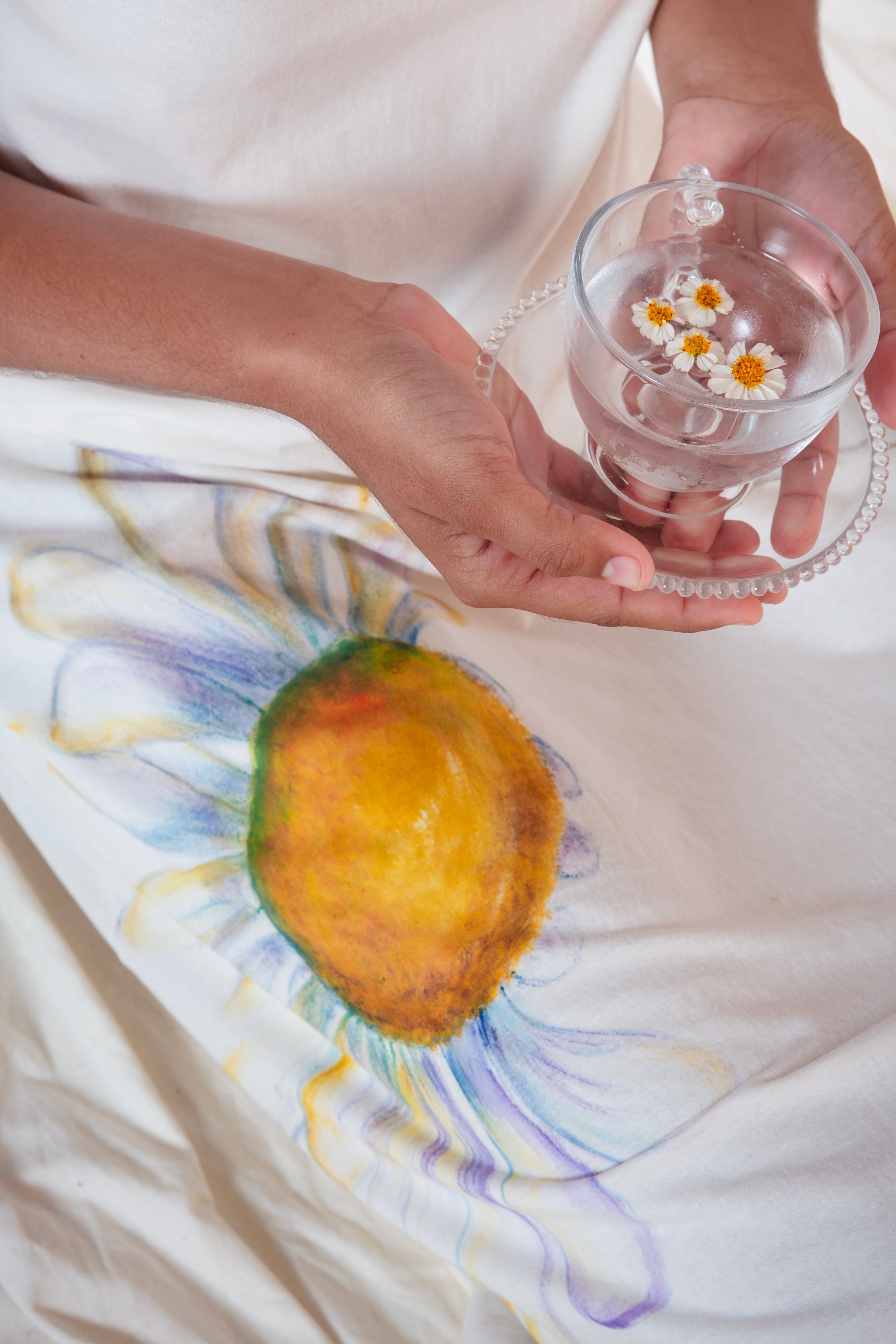 Na versão Camomila, a inspiração vem das forças ancestrais da “mãe das ervas”, nome carinhoso atribuído a Matricaria Chamomilla por ser uma planta doadora de energia. Enquanto suas mini pétalas brancas exalam delicadeza, seu miolo amarelo reflete a potência do sol, excelente para vestir quem deseja expressar autenticidade de forma suave.