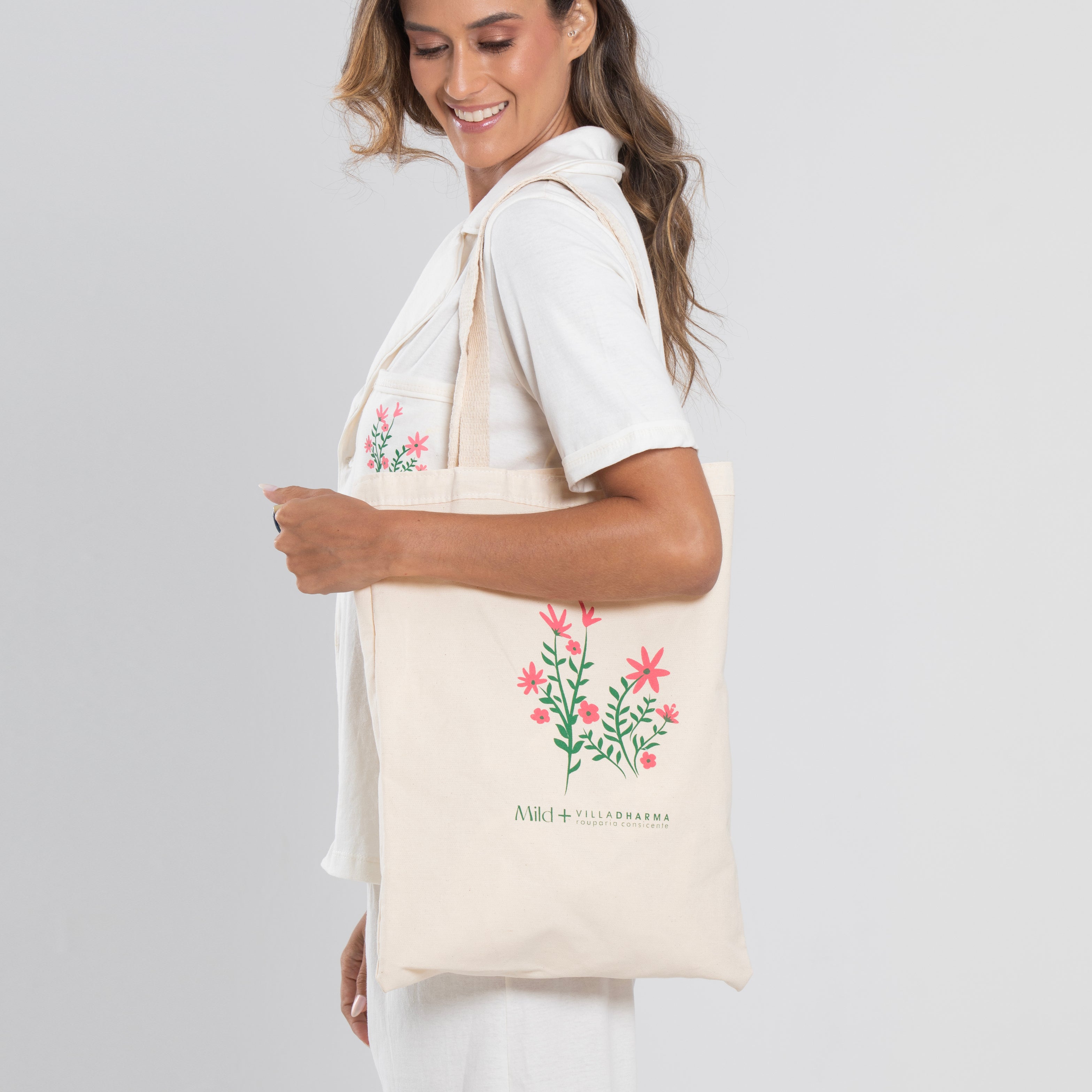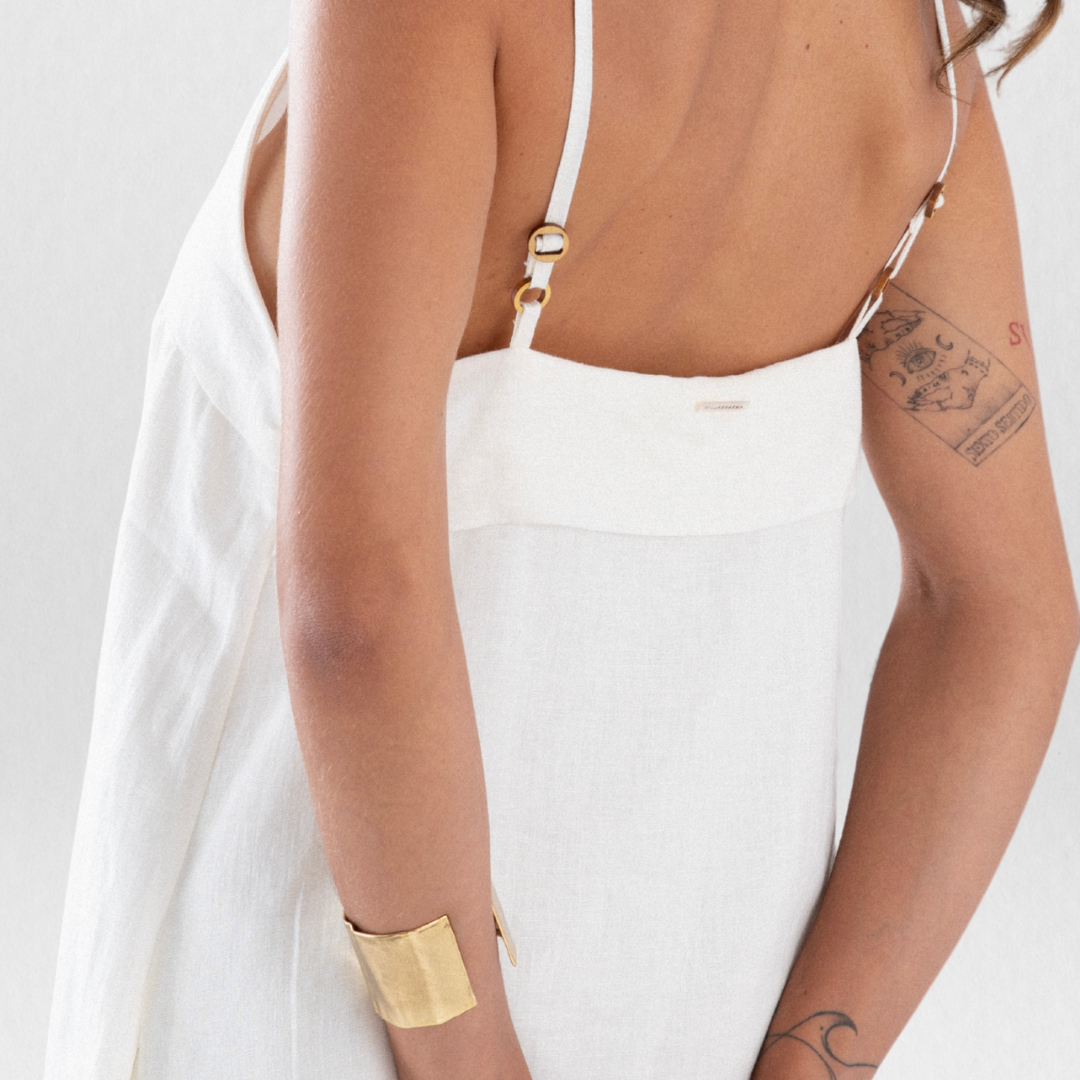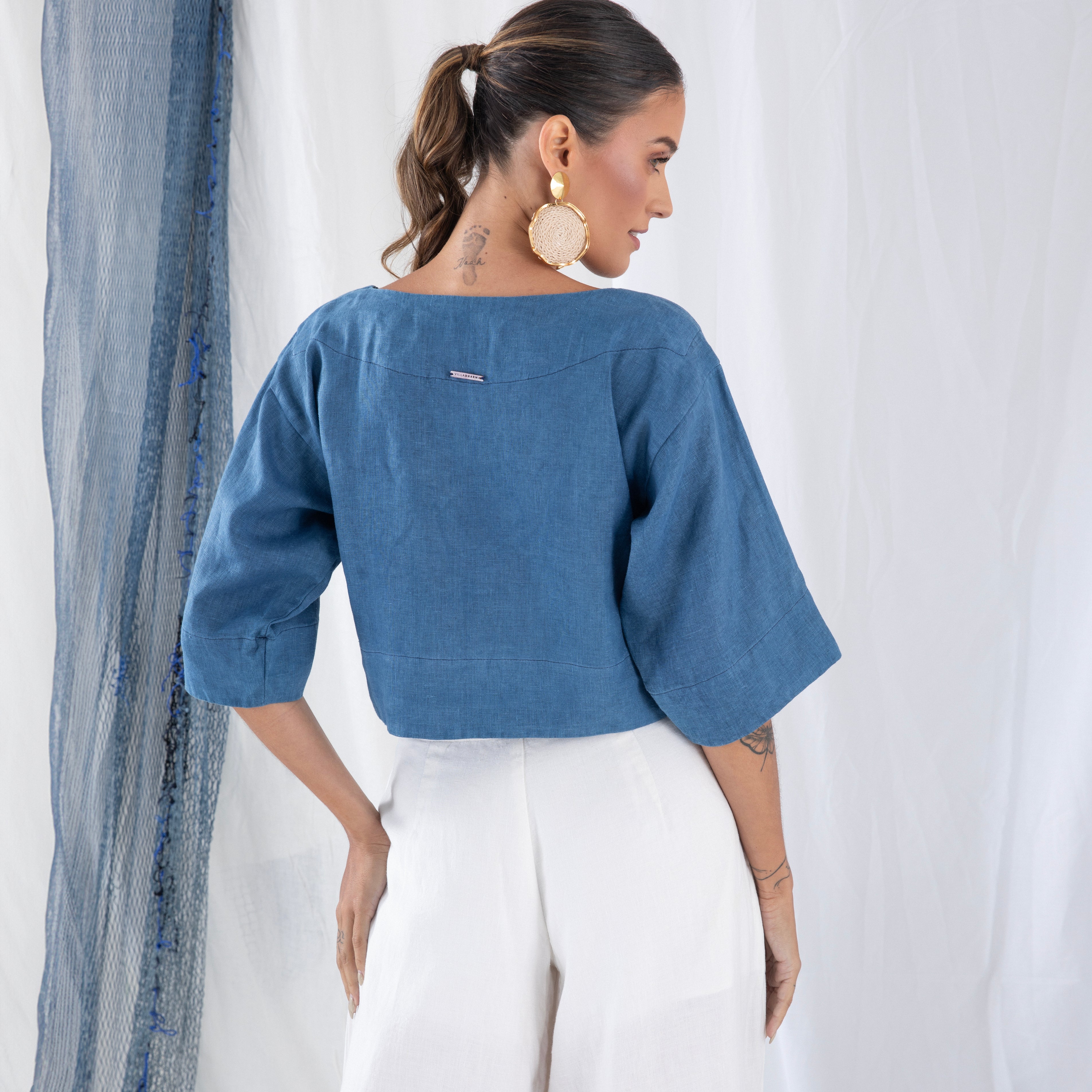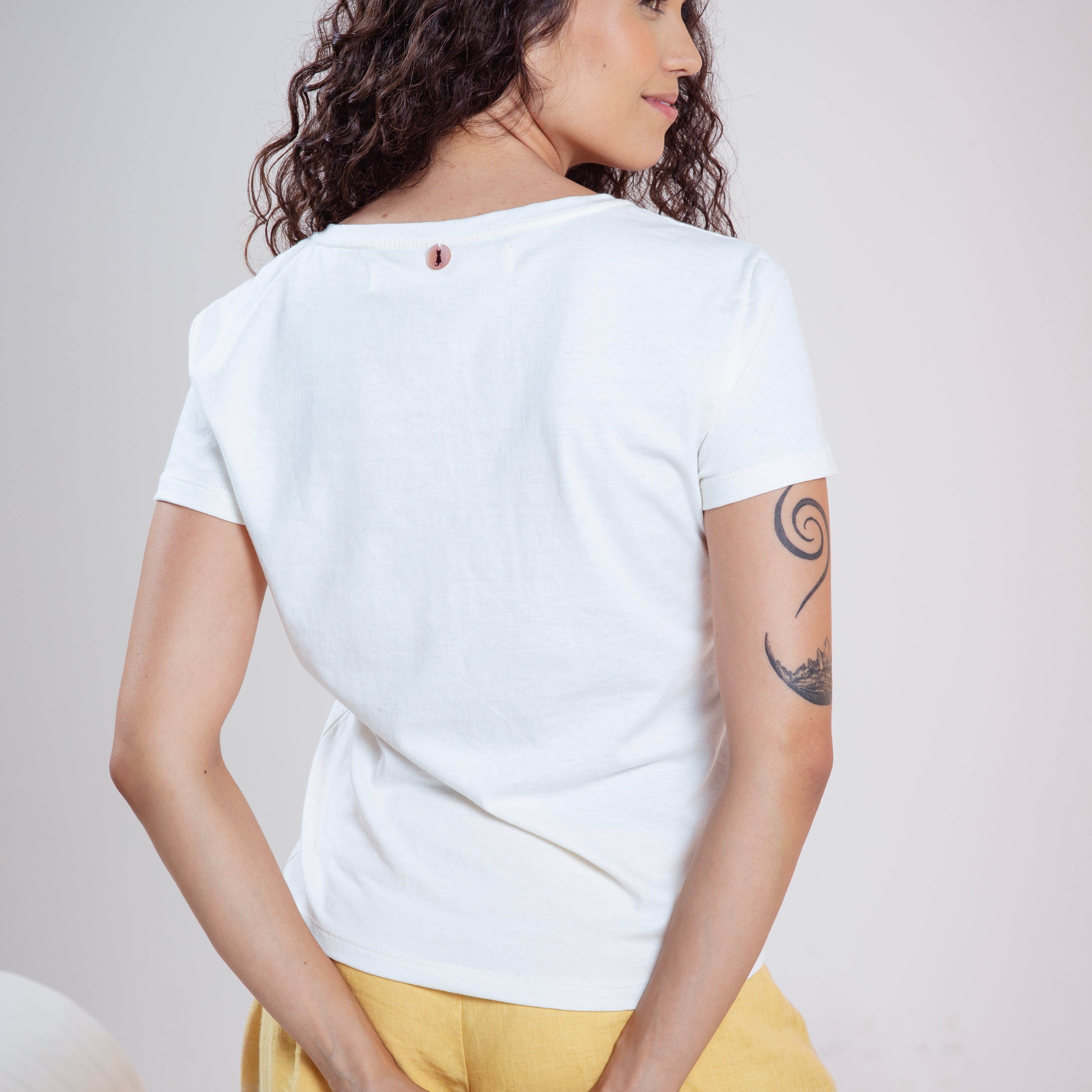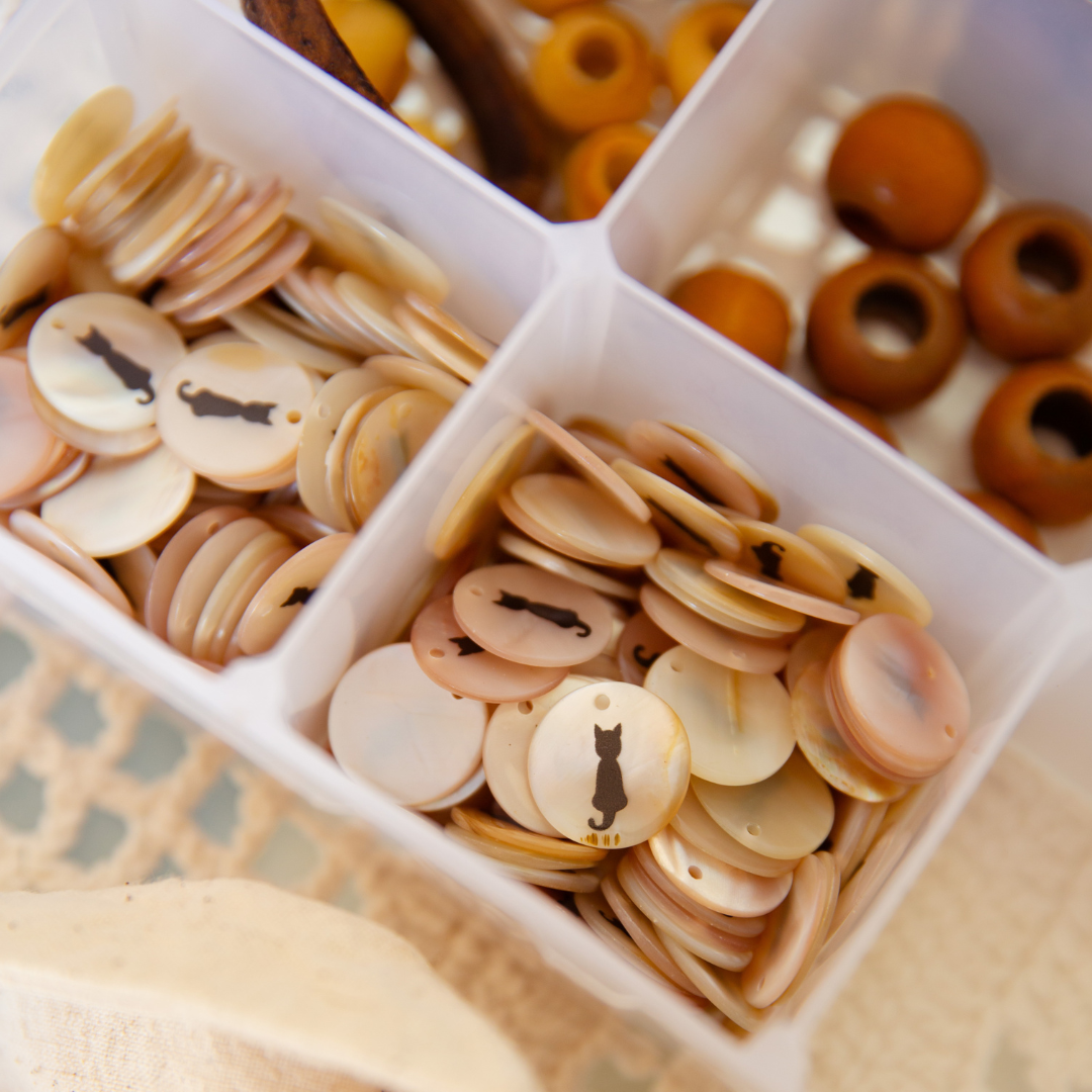 Nossa etiqueta é puro algodão e recebe tintas a base d’água; já nossas plaquetas são de madrepérola, uma concha que pode ser do mar ou do rio, trazendo sofisticação natural à peça.