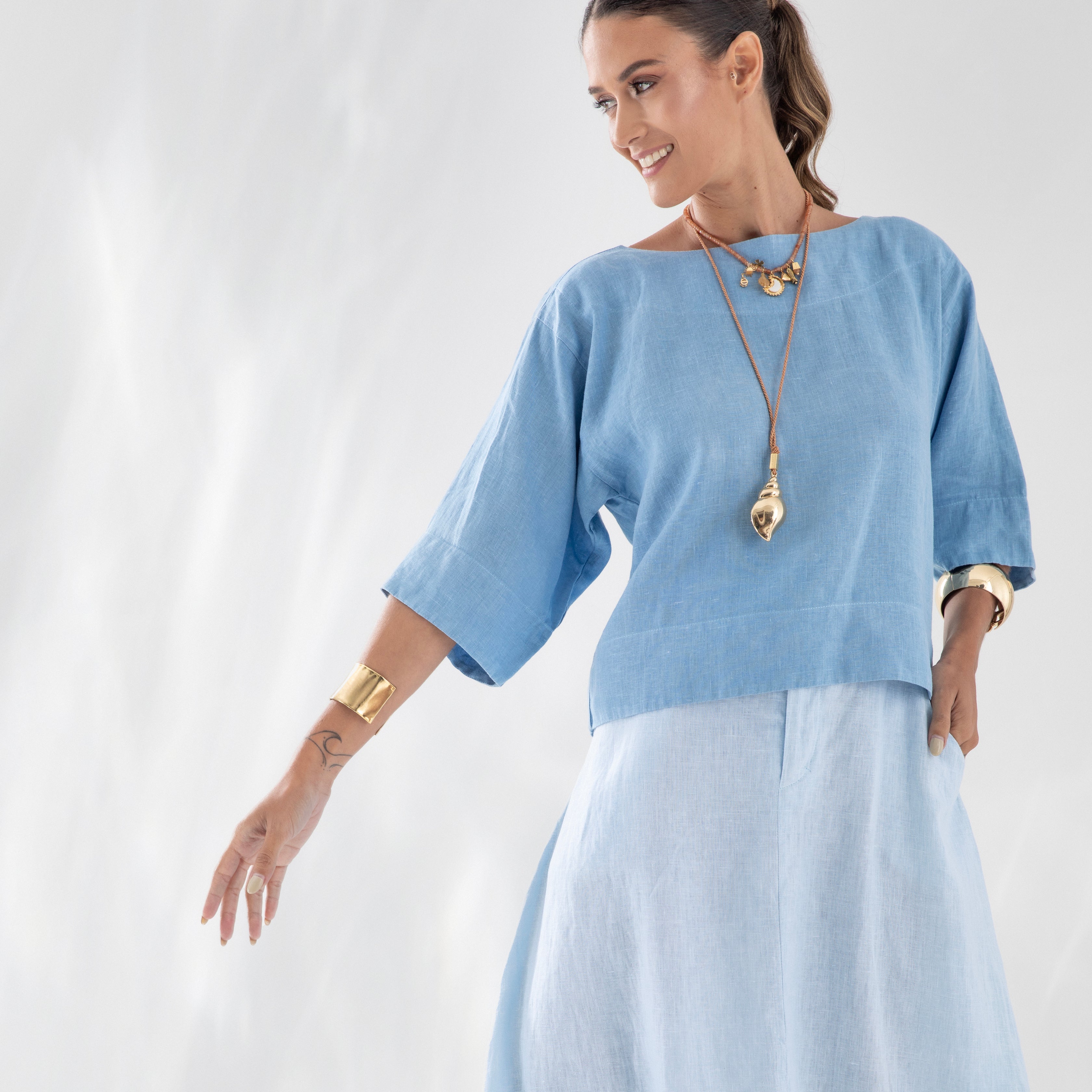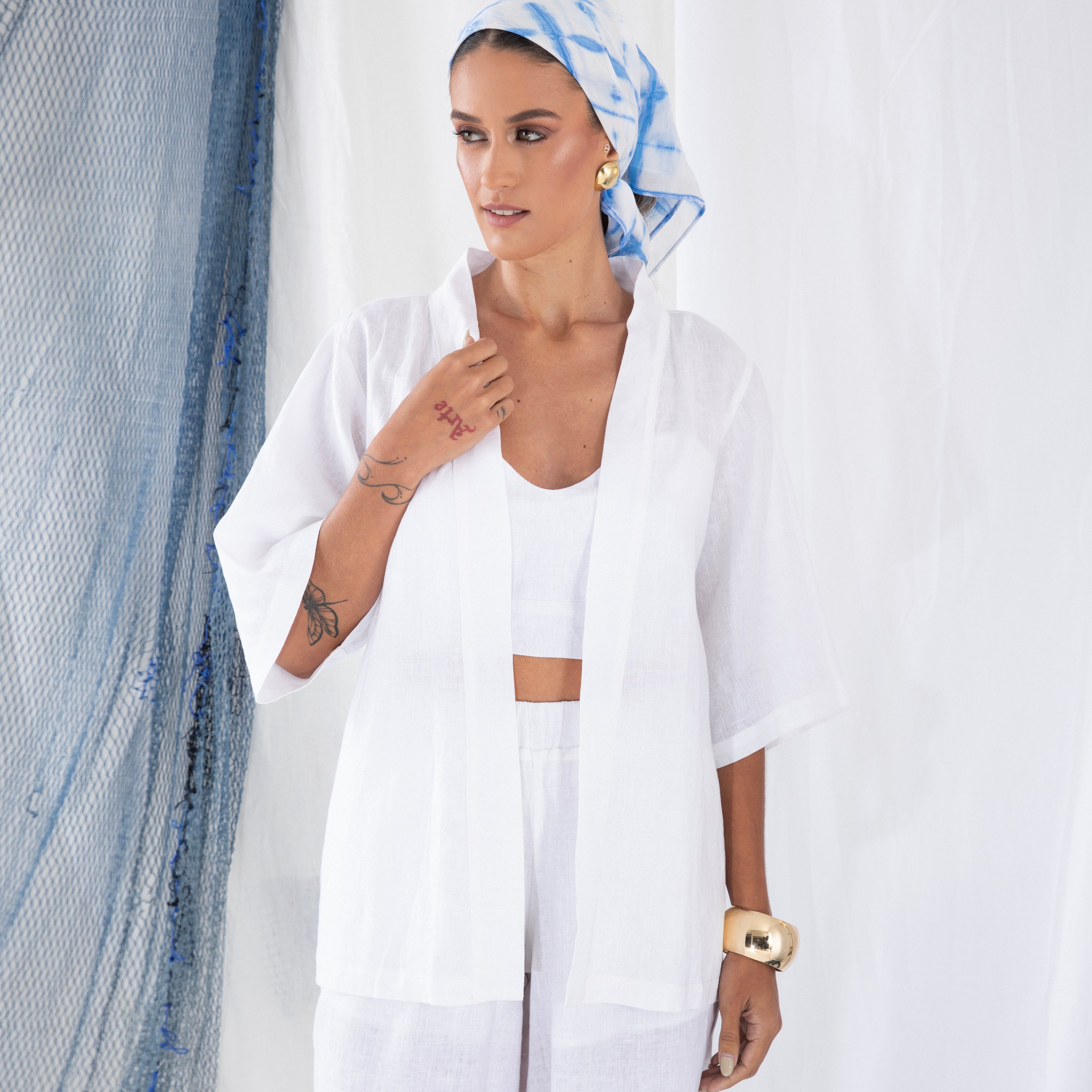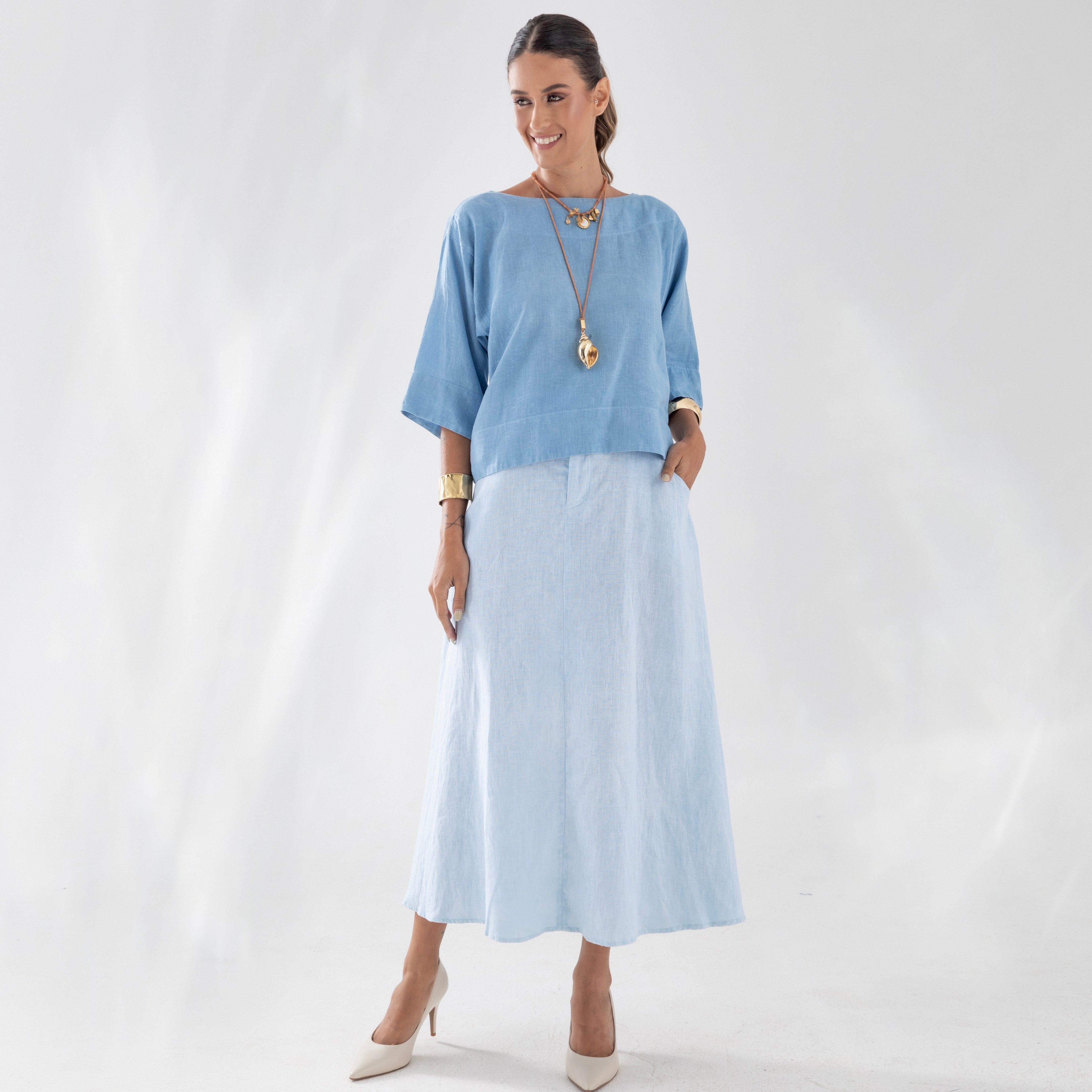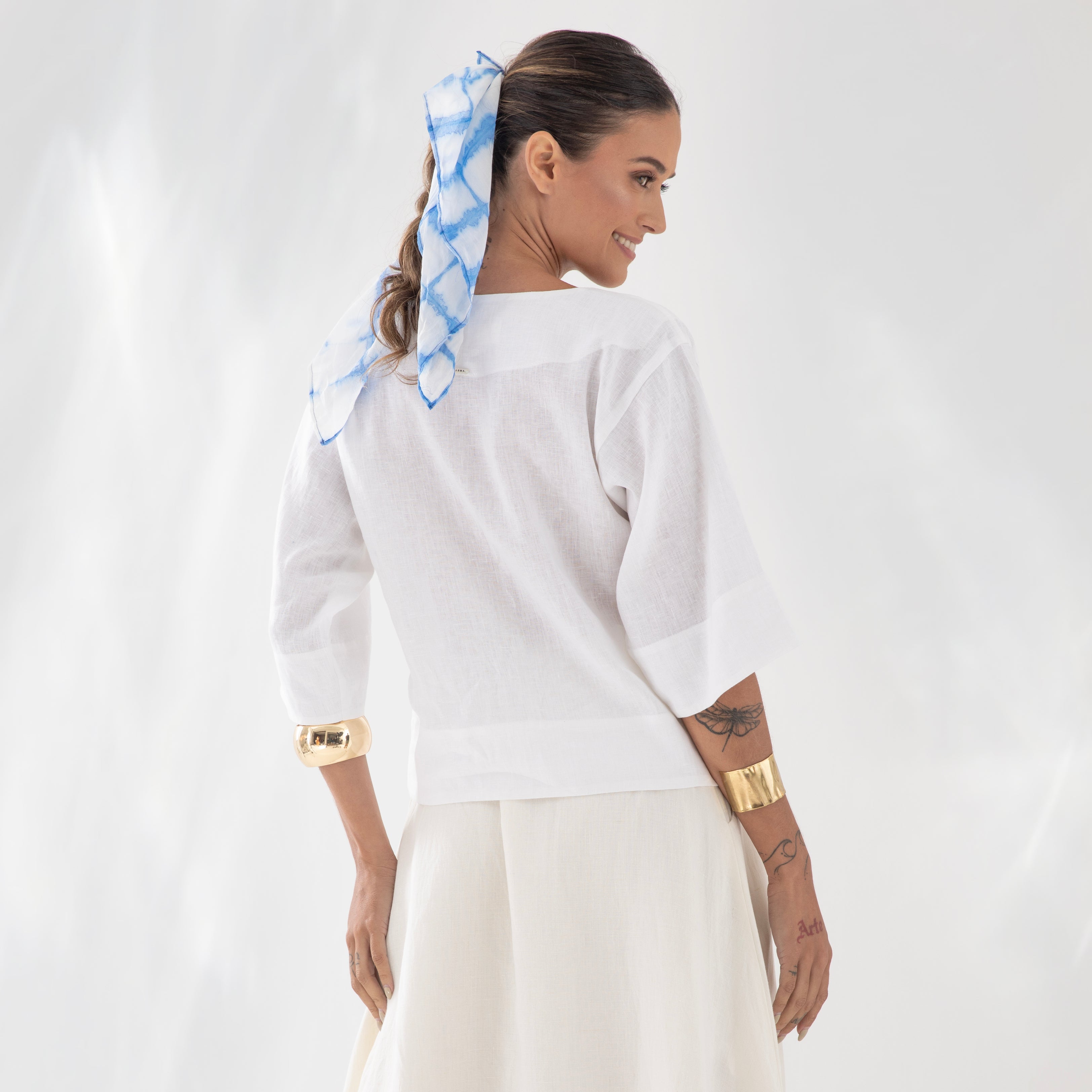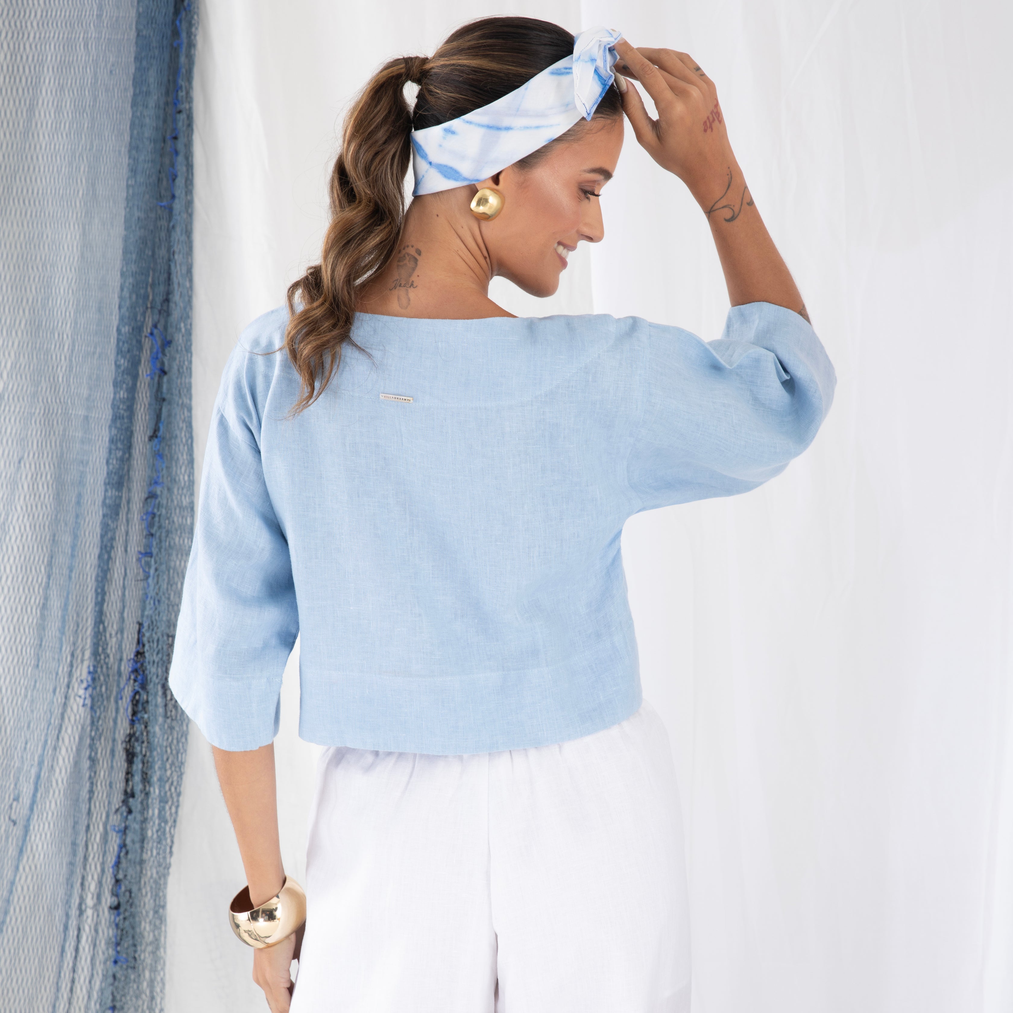 Nossa etiqueta é puro algodão e recebe tintas a base d’água; já nossas plaquetas são de madrepérola, uma concha que pode ser do mar ou do rio, trazendo sofisticação natural à peça.