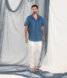 Disponível em tons de azul extraídos de tinturas naturais, a Calça SÉRIE evoca a serenidade e a beleza do mar, unindo a estética natural com a ética consciente, um símbolo da filosofia da Villa Dharma.